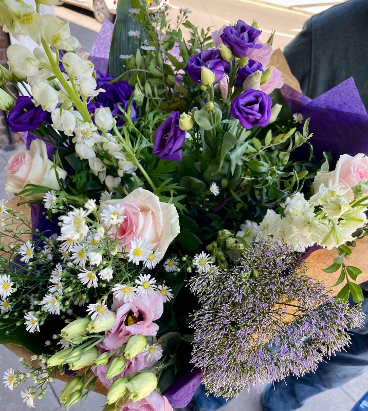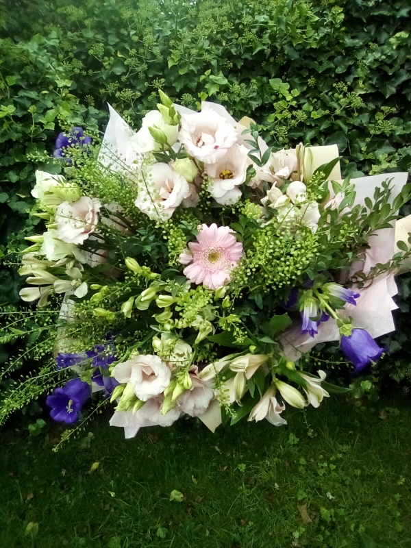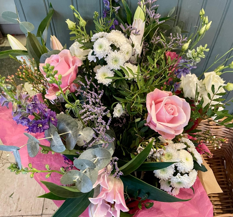 A selection of pale pink and lilac flowers to create a beautiful hand-tied bouquet.