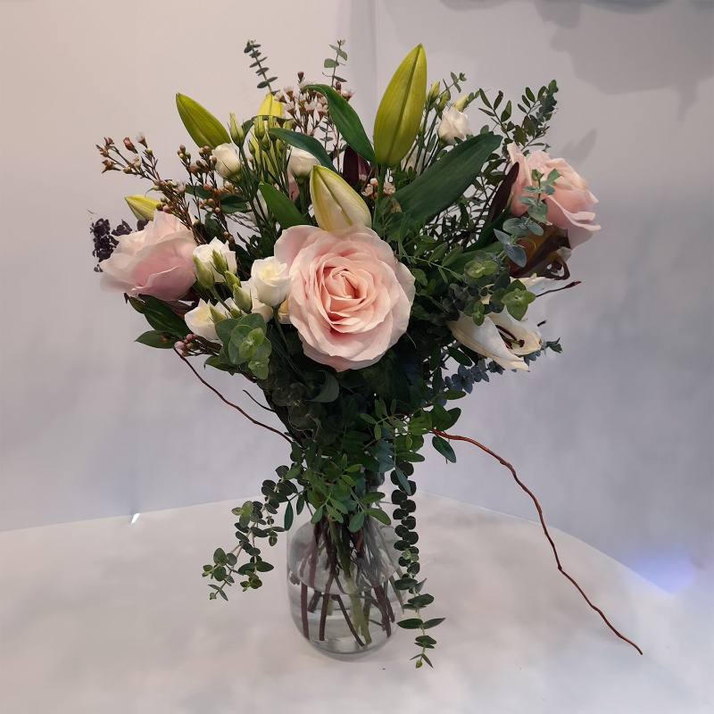 A beautiful hand tie including roses, lilies, eucalyptus and other luxury stems.